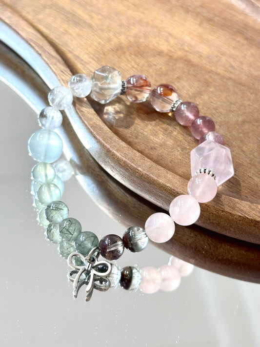 Colorful Aura Bracelet—Green Rutilated Quartz, Prehnite, Green Azeztulite, Green Phantom Crystal, Mint - green Aquamarine, Strawberry Quartz