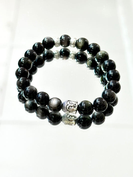 Black Obsidian Bracelet 9.8mm – Gold & Silver Sheen | Healing, Protection Gift