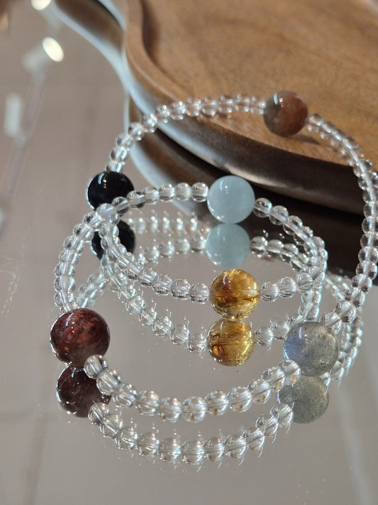 Planet Natural Crystal Bracelet – Clear Quartz, Four Season Phantom, Pyramid Citrine, Aquamarine, Blue Moonstone & Blue Tiger Eye gift idea