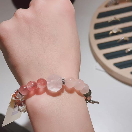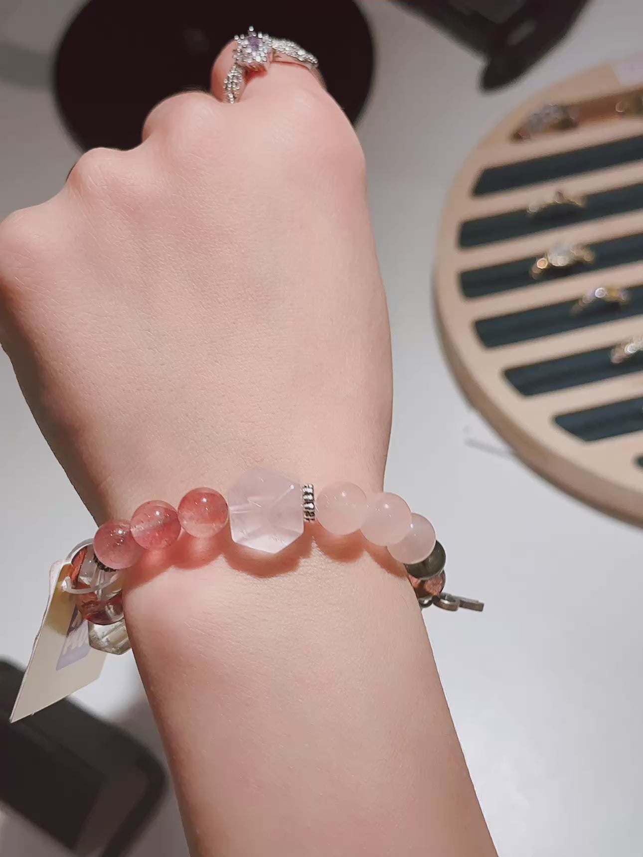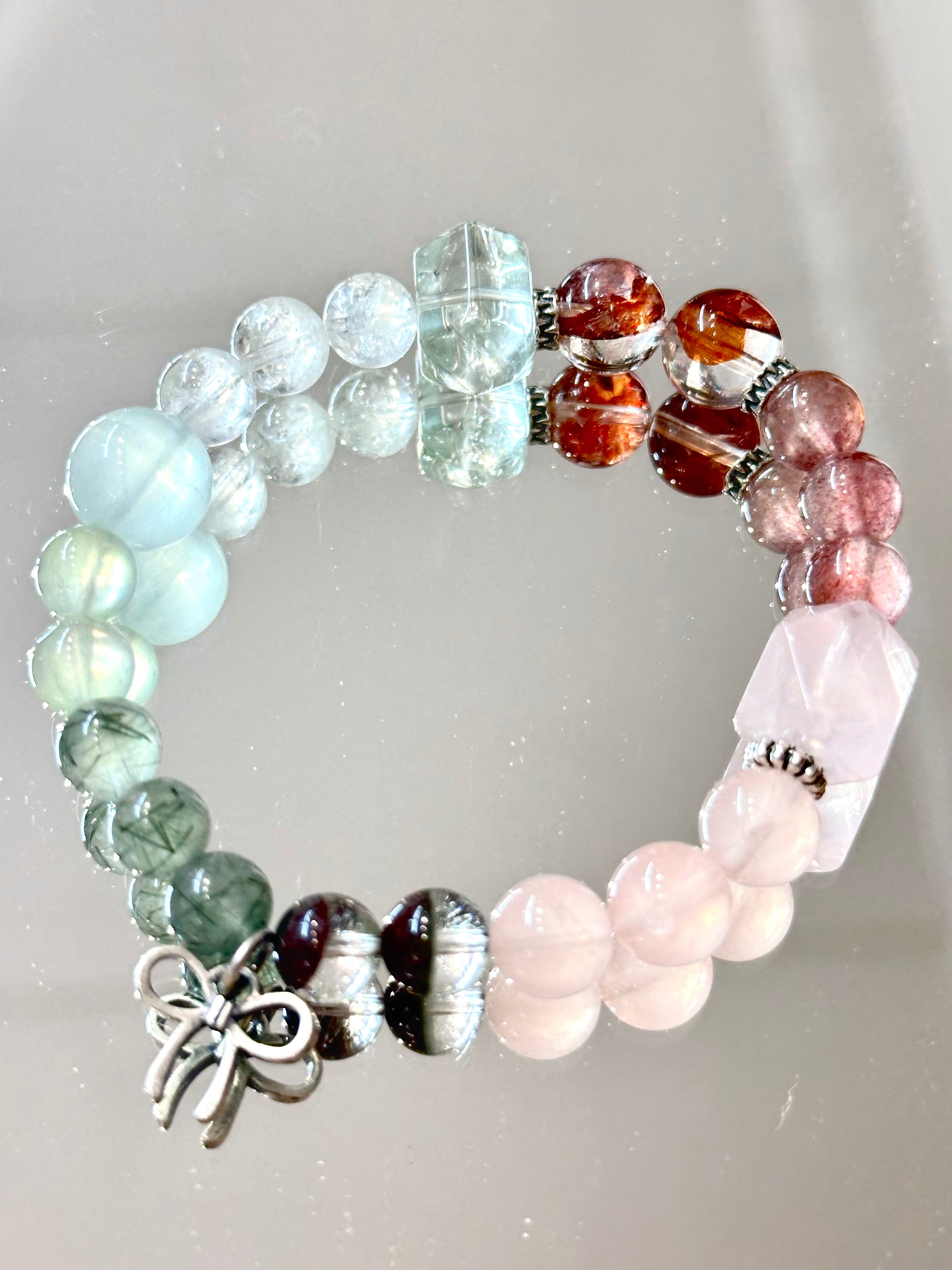 This bracelet combines Green Rutilated Quartz, Prehnite, Green Azeztulite, Red Phantom Crystal, Mint - green Aquamarine, Strawberry Quartz, Rose Quartz and Red Flower Agate. Green Rutilated Quartz stimulates vitality. Prehnite conveys hope. Green Azeztulite brings luck. Red Phantom Crystal soothes emotions. Mint - green Aquamarine calms the mind. Strawberry Quartz attracts positive relationships. Rose Quartz adds tenderness. Red Flower Agate brings passion. The convergence of various gemstones endows the bracelet with colorful energy, protecting the body and mind and enhancing charm.