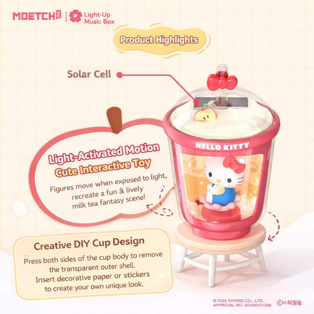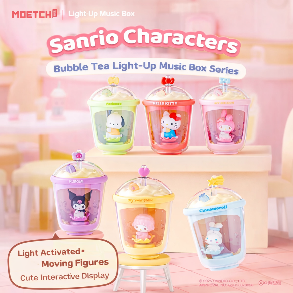 Meet the cutest thing to hit your shelf — the MOETCH × Sanrio Milk Tea Cup Light-Up Blind Box Series! Each figure sits inside a dreamy translucent bubble tea cup, and here’s the magic: just shine any light on it and your Sanrio character starts to move all on its own — no batteries, no charging needed! 🌟