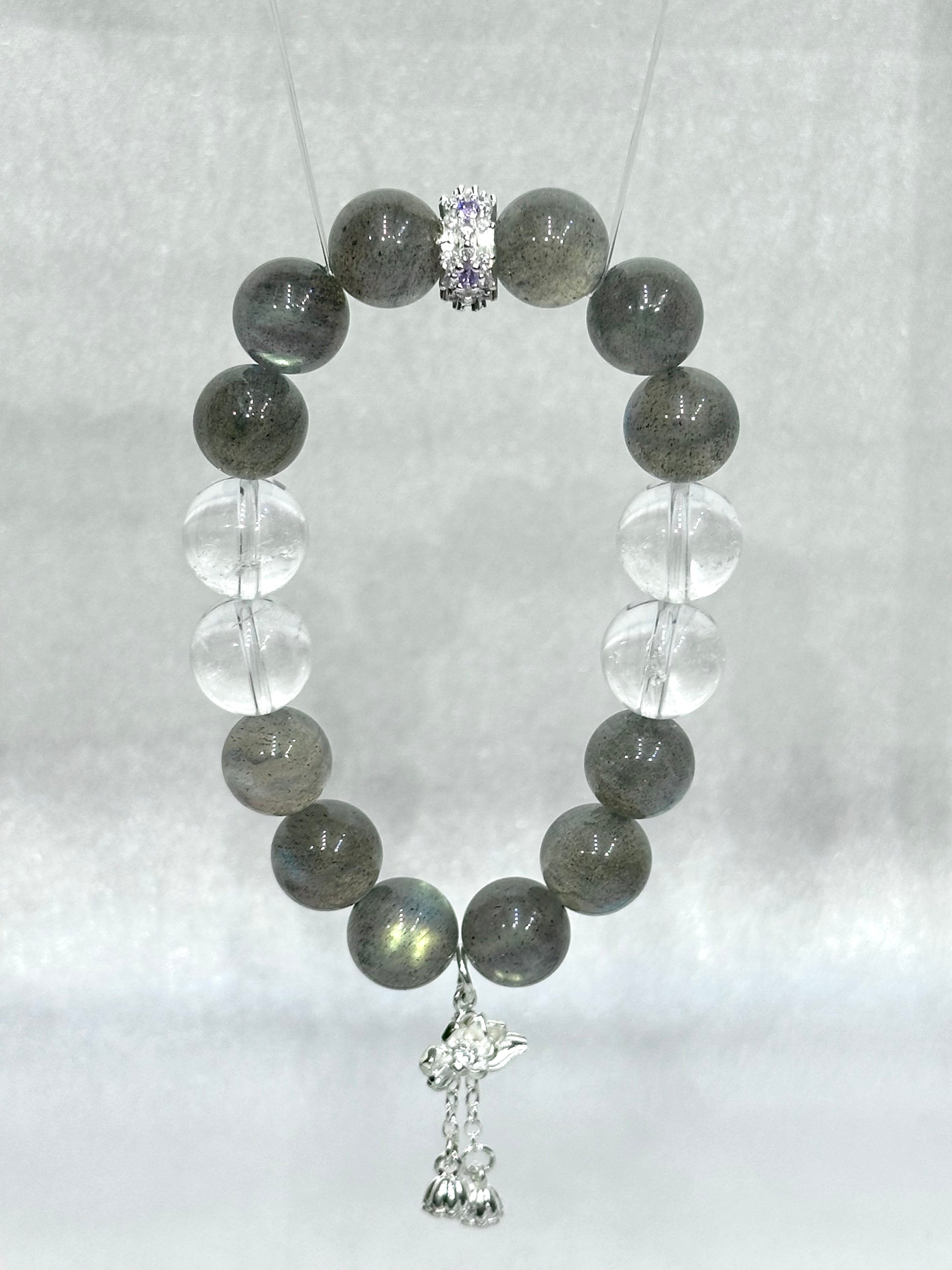 Embrace elegance and grounding energy with our Mystic Moonlight Bracelet, thoughtfully handcrafted with premium-grade gray labradorite and clear quartz beads. This stunning piece showcases a beautiful interplay of soft iridescence and crystal clarity.